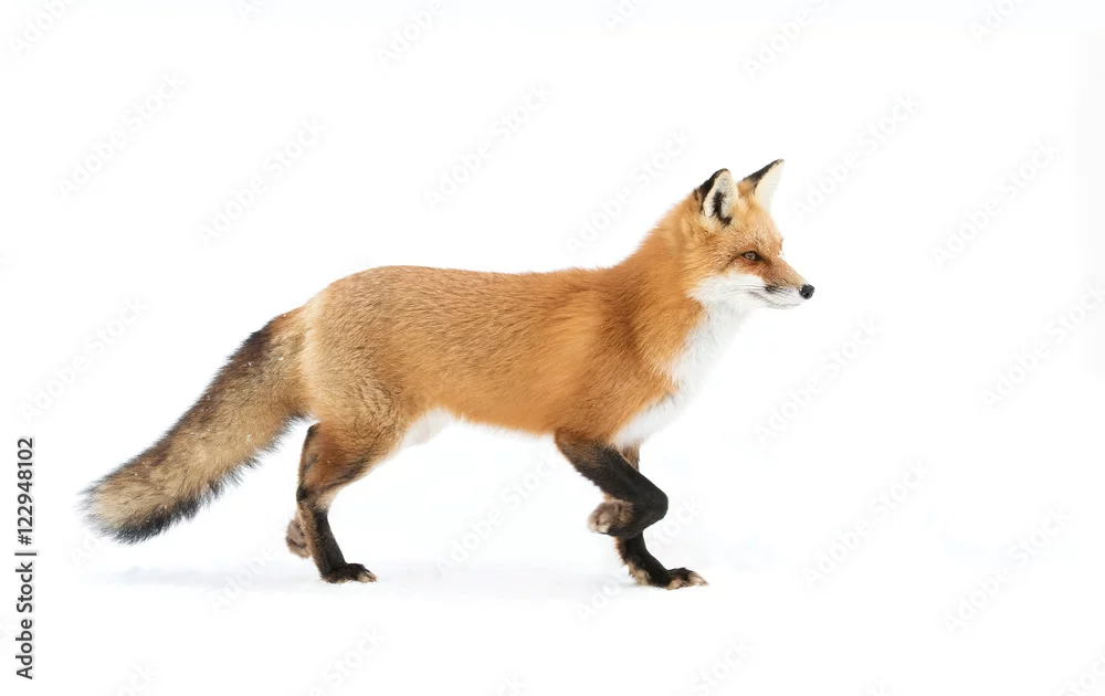 Fototapeta Czerwony lis (Vulpes vulpes) z krzaczastym ogonem na białym tle na polowaniu w zimowym śniegu w Algonquin Park, Kanada