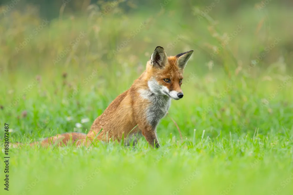 Fototapeta Lis rudy drapieżnik siedzący na zielonej łące - lisy - Picturewall.pl
