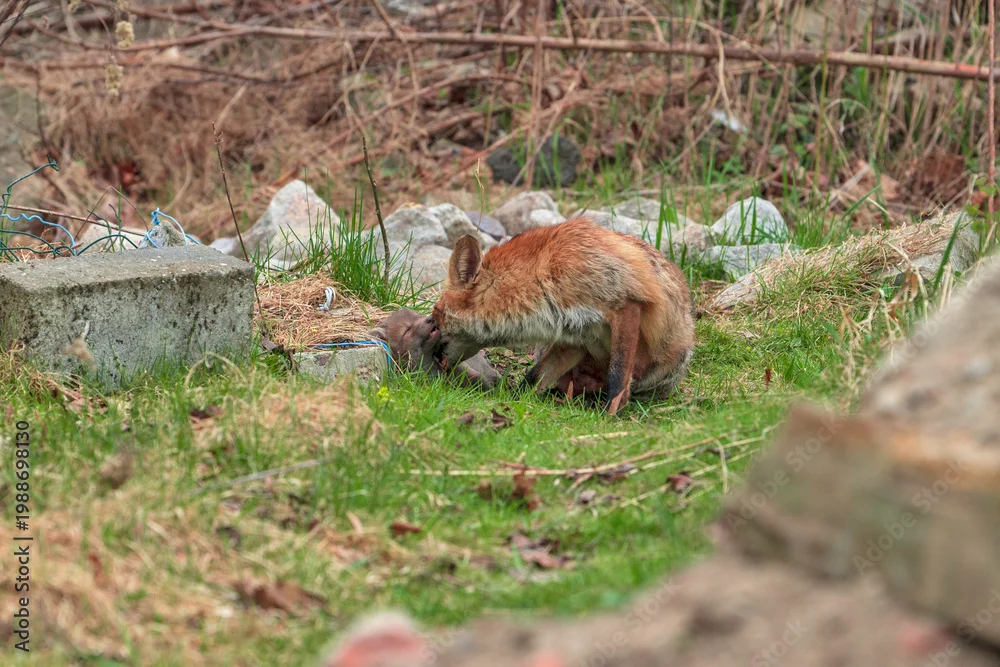 Fototapeta Lisica ruda z młodym szczenięciem w parku miejskim w Warszawwie - lisy - Picturewall.pl