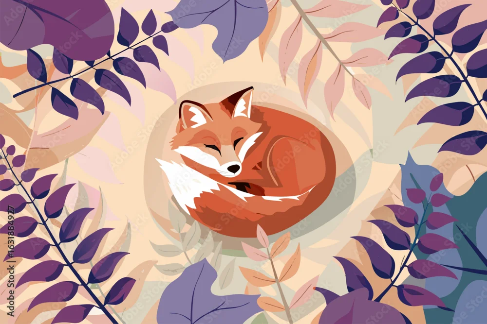 Fototapeta Śpiący lis zwinięty w kłębek w jesiennym lesie. Leśne tło ze zwierzęciem, idealne do projektów dla dzieci.
