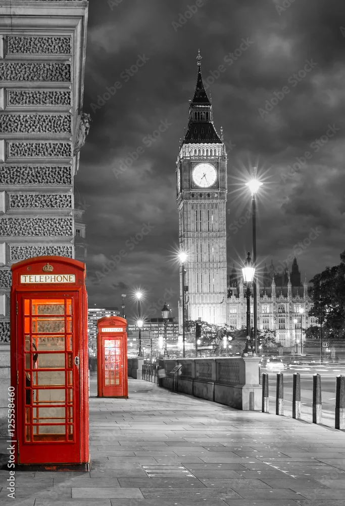 Fototapeta Czerwone budki telefoniczne w nocy przed Big Ben w Londynie z pochmurnego nieba