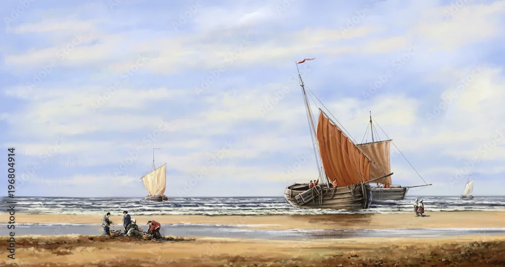 Fototapeta Obrazy olejne pejzaż, sztuka cyfrowa, morze, rybak, łodzie, statki. - malarstwo - Picturewall.pl