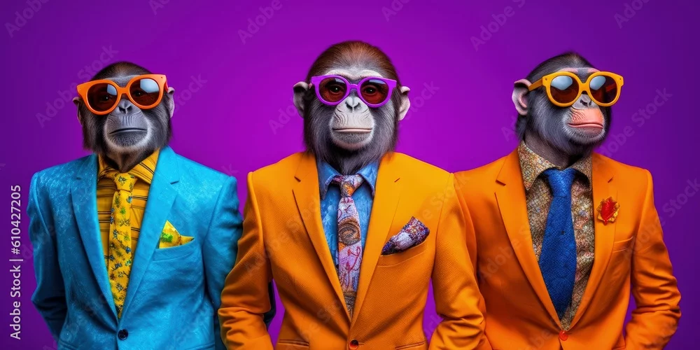 Fototapeta a group of anthropomorphized monkeys wearing colorful suits and sunglasses posing created with generative AI - małpy - Picturewall.pl