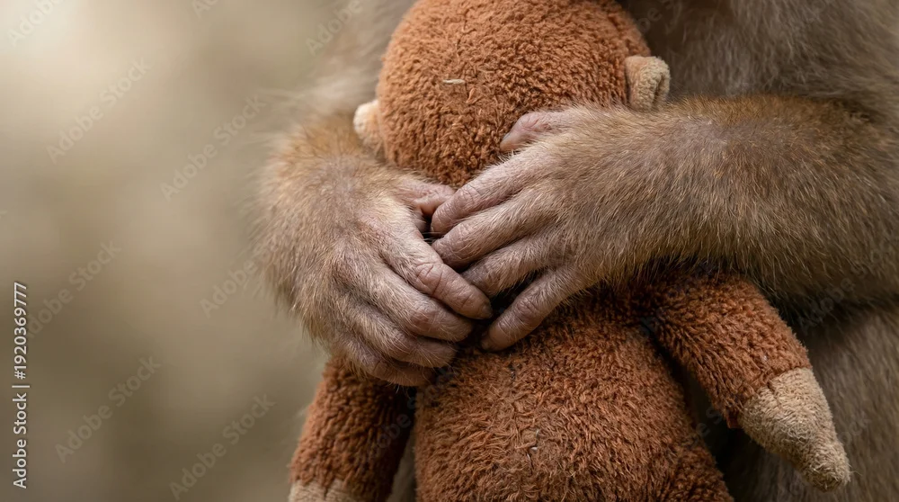 Fototapeta Punch baby macaque holding plush toy close, emotional support object symbolizing loneliness, attachment, comfort and orphan monkey emotional connection