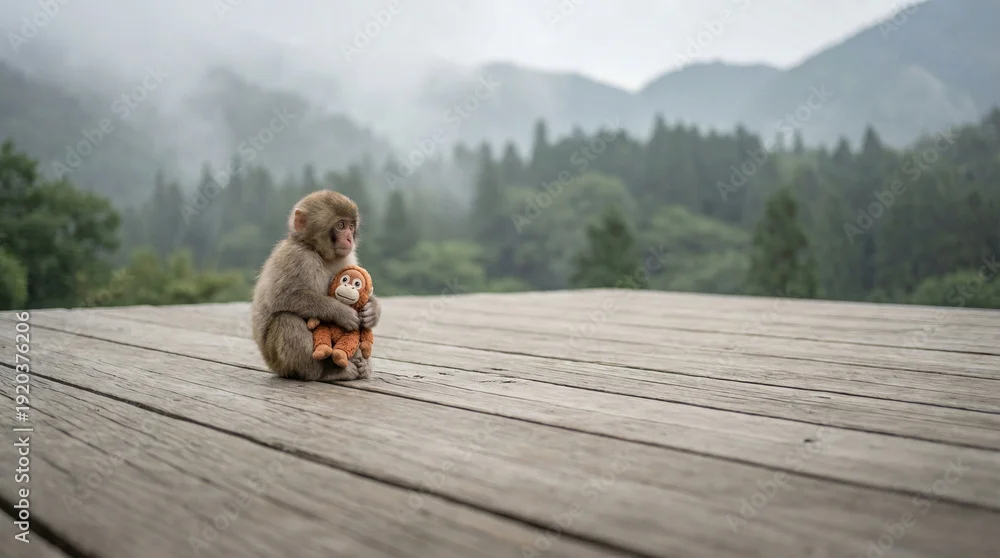 Fototapeta Punch baby macaque sitting alone on wooden platform hugging plush toy, orphan monkey expressing loneliness, emotional attachment and vulnerability concept - małpy - Picturewall.pl