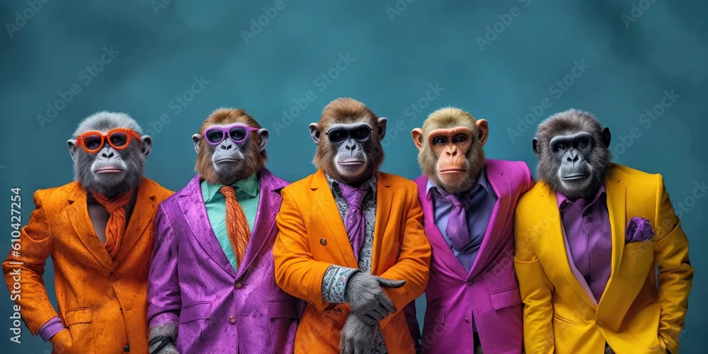 Fototapeta a group of anthropomorphized monkeys wearing colorful suits and sunglasses posing created with generative AI