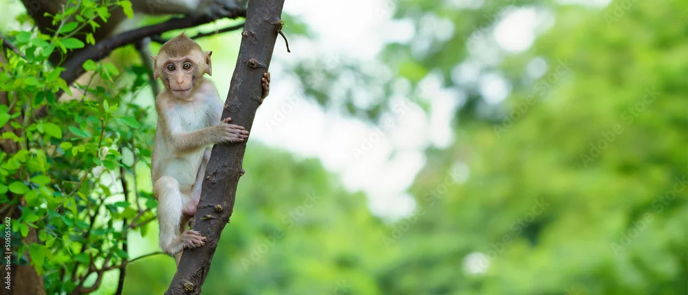 A little monkey climbs on the Pithecellobium dulce trees in the natural forest and eye contact at Khao Ngu Stone Park, Ratchaburi, Thailand..Leave space for banner text input.