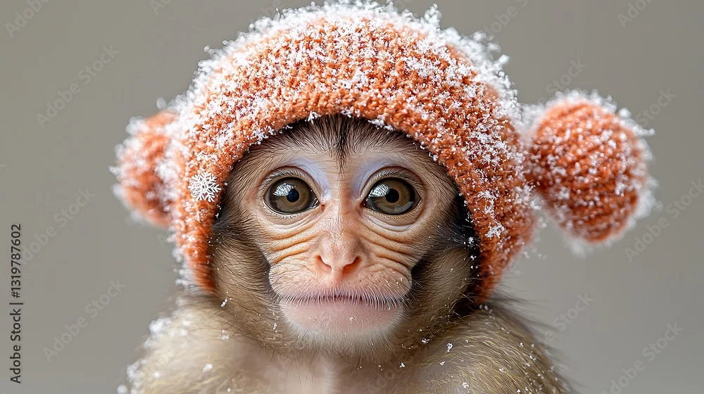 Fototapeta A monkey wearing a knitted hat covered in snow
