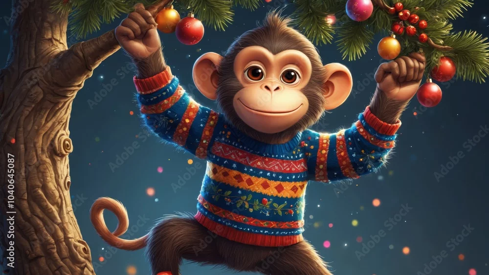 Fototapeta A playful monkey enjoys the holiday spirit while hanging from a Christmas tree branch