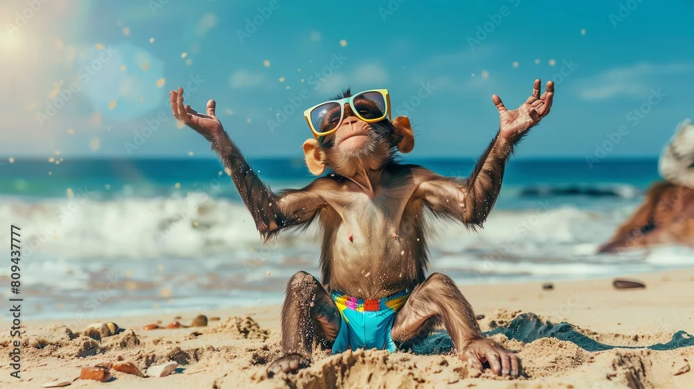 Fototapeta A playful monkey in hipster swim trunks, making sand angels on the beach, with quirky oversized sunglasses