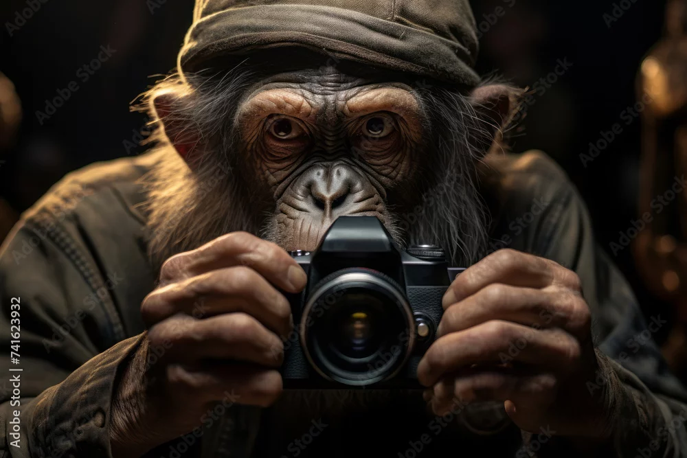 Fototapeta chimpanzee monkey holds a camera in his hands and takes pictures. - małpy - Picturewall.pl