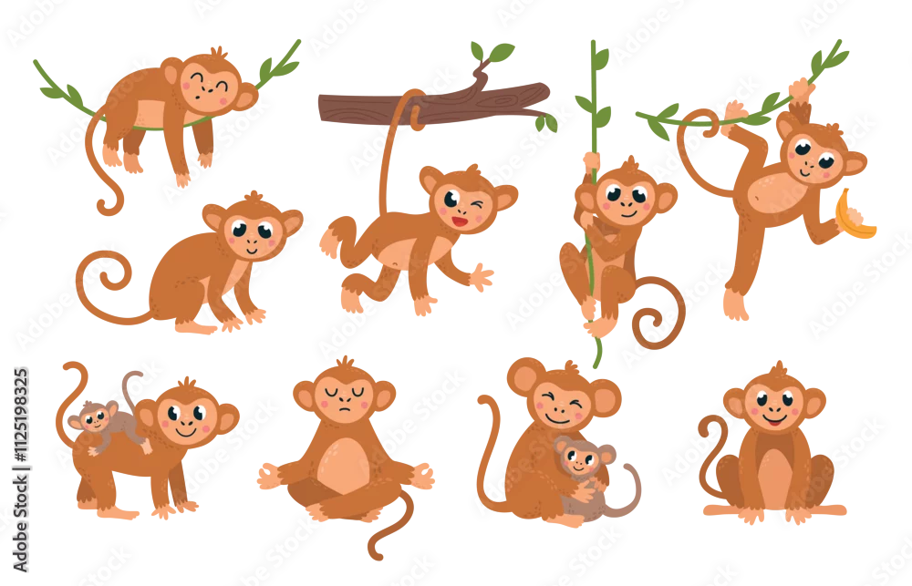 Fototapeta Cute monkey characters. Cartoon jungle monkeys on liana, hold banana, with baby. Tropical animals in various poses, funny classy vector set - małpy - Picturewall.pl