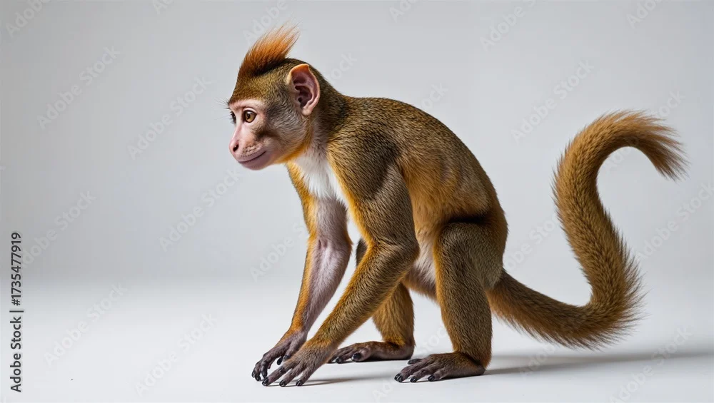 Fototapeta Full-body squirrel monkey with tail down, side profile and limbs shown, isolated on white
