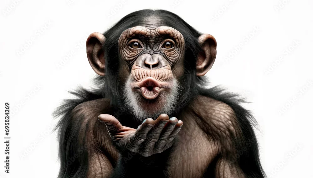 Happy monkey portrait showing love making kiss with hand. Chimpanzee making Kiss to air with her Hand, isolated on white background, Generative Ai