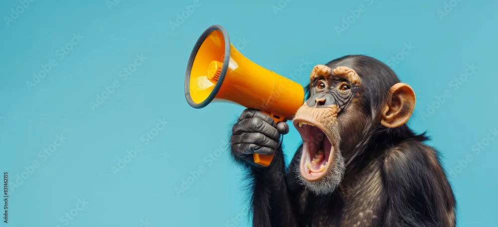 monkey holding a megaphone. screaming, Promotion, action, holiday, ad, job questions. Vacancy. Business discount concept, communication, information, news, team media
