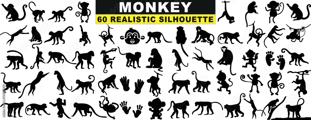 Fototapeta Monkey Silhouette Collection, 60 unique, realistic poses. Ideal for design, vector art, graphics. Enhance creative projects with these detailed, high quality images. Versatile use in print, web design