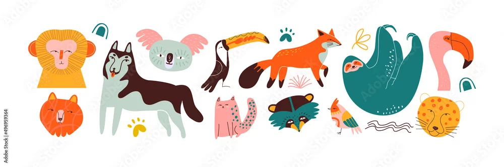 Set of trendy animal doodle and abstract nature icons on isolated background. Colorful wild animals collection. Includes koala, monkey and birds.