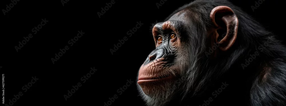 The head of a chimpanzee monkey in profile close-up. Panoramic image on the right, of the head of a wild animal on the background of a black isolated banner. Generative AI.