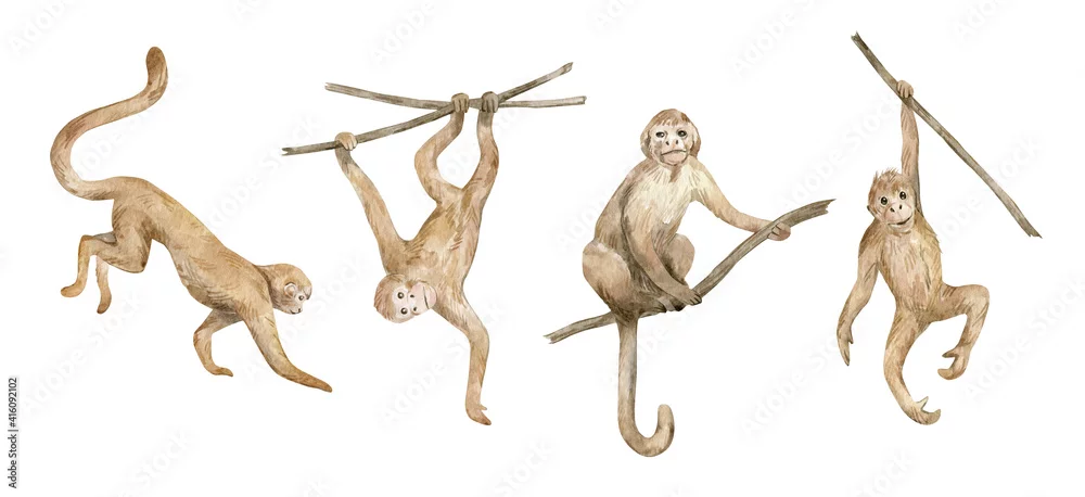 Fototapeta Watercolor cute monkeys isloated on white. Hand drawn illustration with primate animals. Tropical wildlife. Ape, chimpanze character, for textile, wallpaper, poster