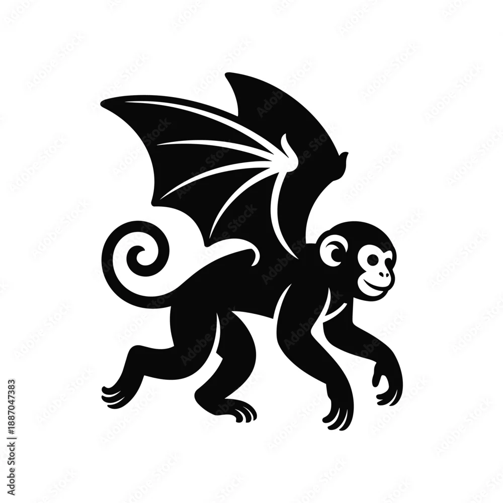 Fototapeta Whimsical flying monkey silhouette with bat wings and curly tail for fantasy and mischief themes