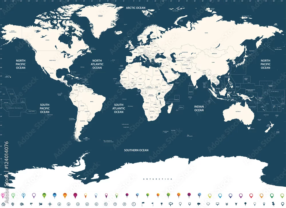 Fototapeta wektor bardzo szczegółowa mapa polityczna świata z nazwami krajów i oceanów oraz ikonami lokalizacji \ nawigacji. Wszystkie warstwy zostały odłączone i oznaczone. Wektor