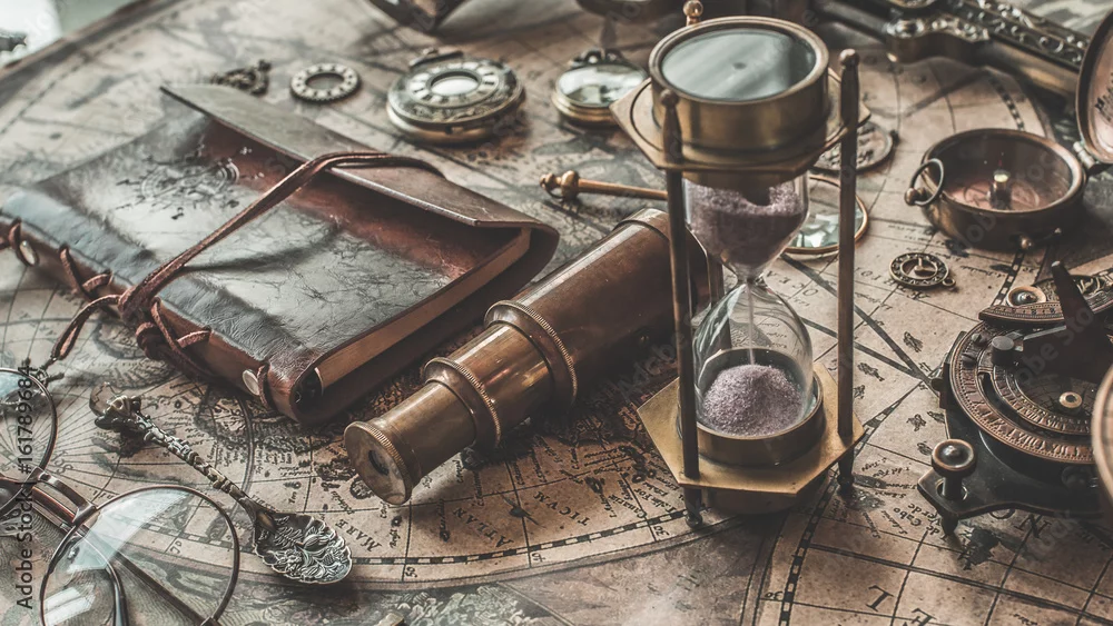Fototapeta Antyczny kompas, lampa naftowa i lornetka
