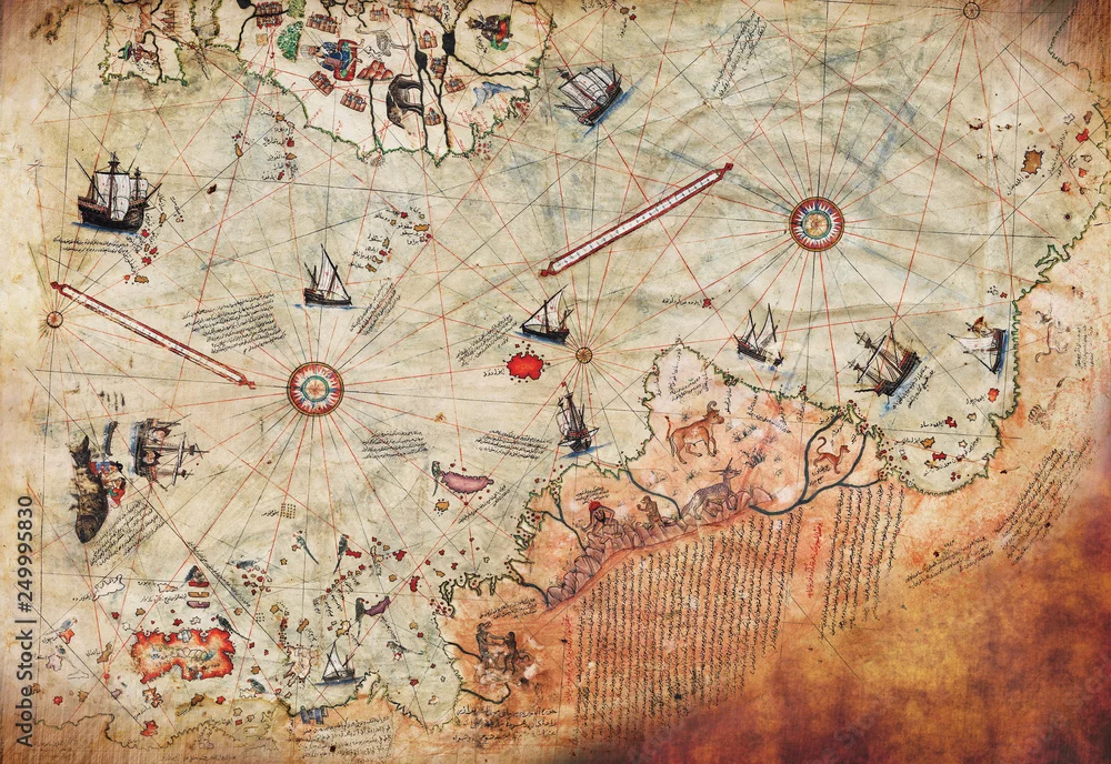 Fototapeta Projekt tapety 3D ze starą mapą statku piri reis do druku na ścianie