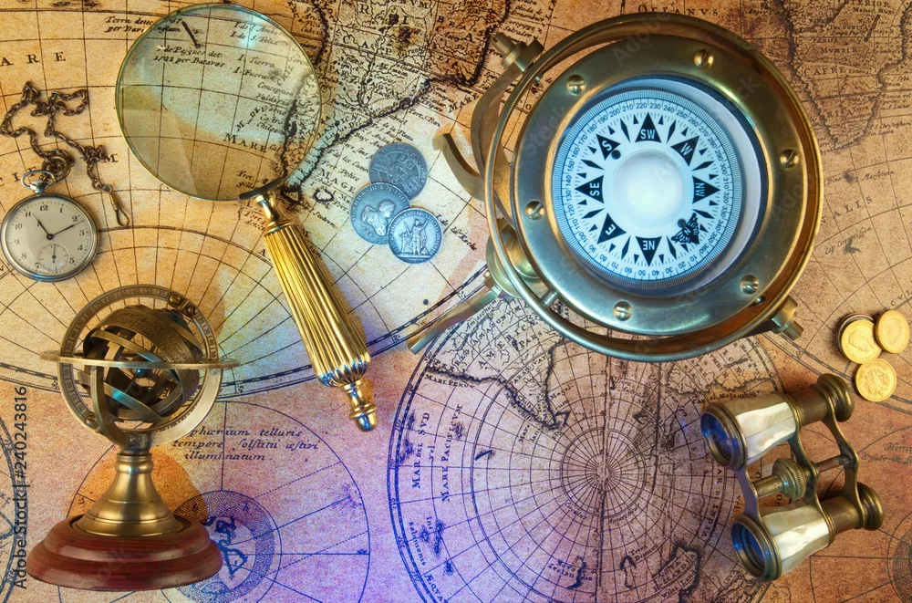 Fototapeta Stary glob zodiaku, astrologiczny. Mapa vintage, stare monety. Latarnia statku retro, lornetki, sekstant. Antyczny kompas. Świecznik, zegarek i lupa Tło podróży i grawerowania morskiego. Koncepcja kaptura skarbów.