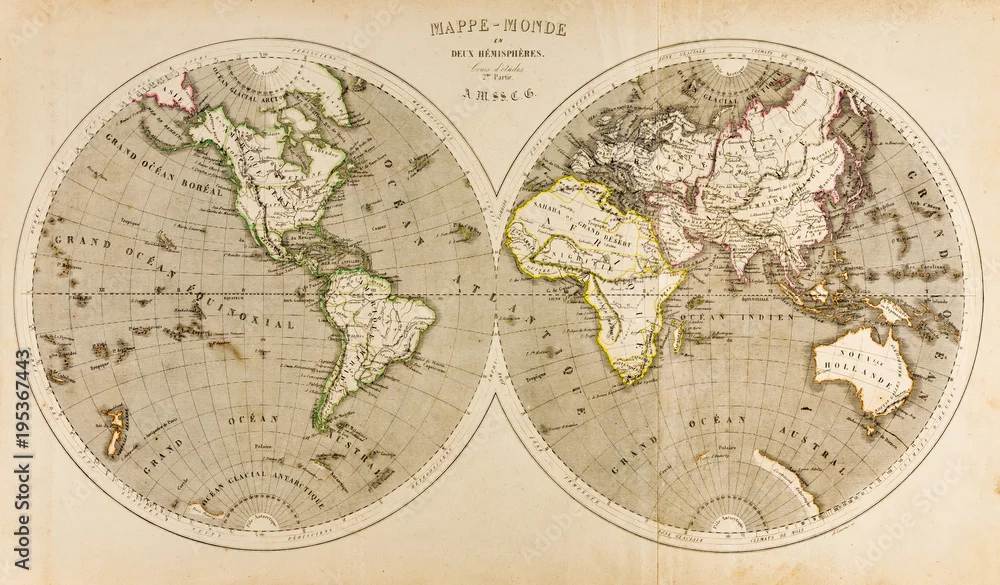 Fototapeta Antyczna mapa świata na dwóch półkulach, retro, XIX wiek