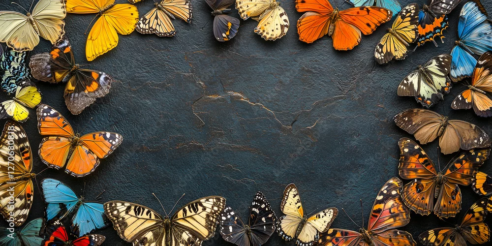 Fototapeta Draufsicht auf einen Rahmen mit Schmetterlinge und mit Platz für Text in der Mitte - Werbeschild Fllyer - motyle - Picturewall.pl