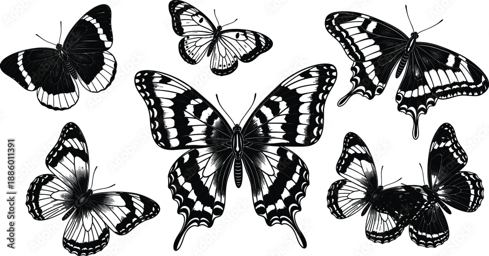Black and white butterfly illustration set, detailed vintage engraving insects collection, elegant nature artwork, hand drawn realistic lepidoptera design