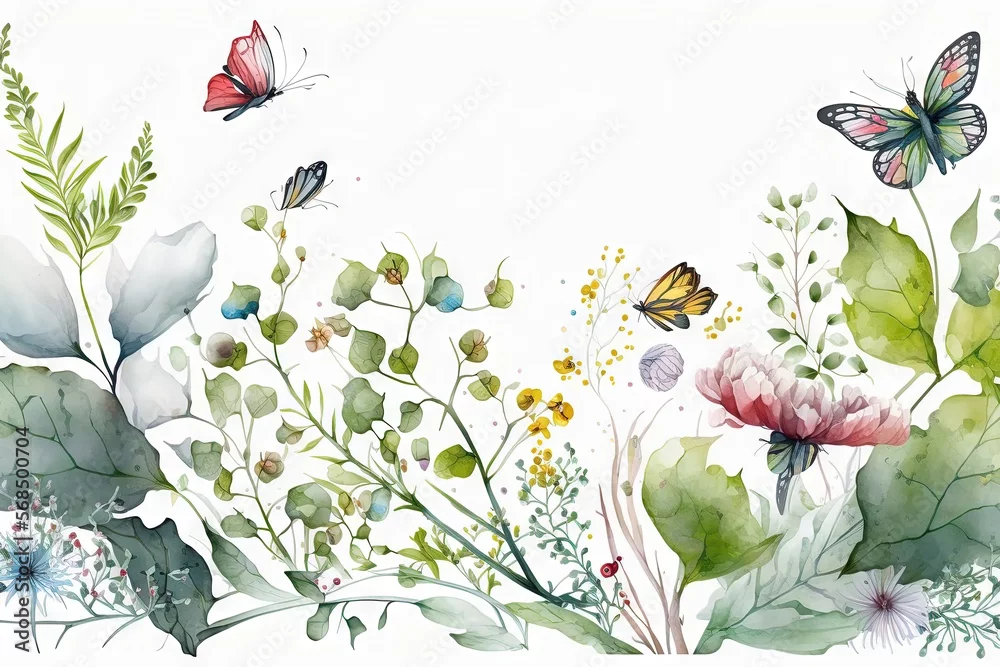 Fototapeta Bordure horizontale harmonieuse avec fleurs multicolores abstraites, feuilles et plantes vertes, papillons volants. Motif isolé à l'aquarelle sur fond blanc.