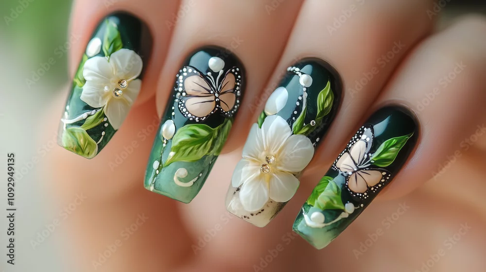 Fototapeta Fantazyjna stylizacja paznokci z subtelnymi, białymi kwiatami, harmonijnie współgrającymi z precyzyjnie namalowanymi motylami, nadającymi wzorowi elegancji i wiosennego uroku.