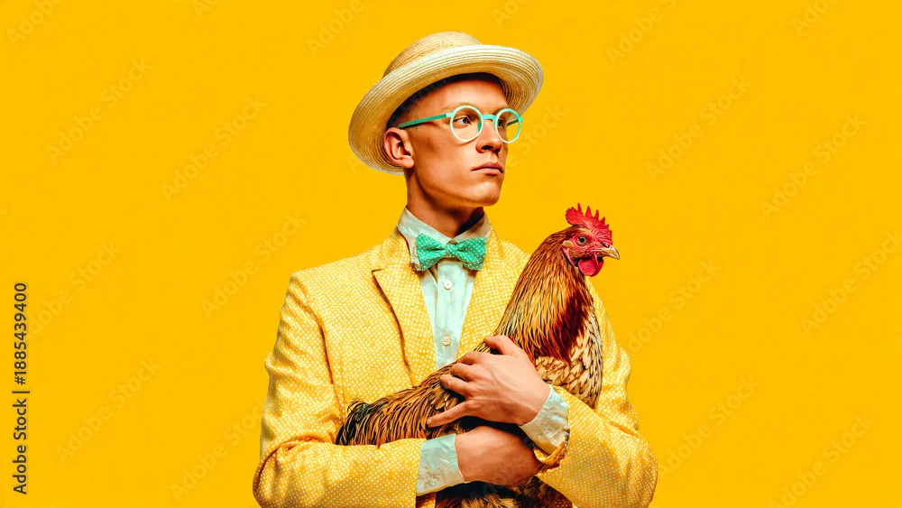 Fototapeta Homme portant un chapeau et un nœud papillon tenant une poule rousse dans ses bras - motyle - Picturewall.pl