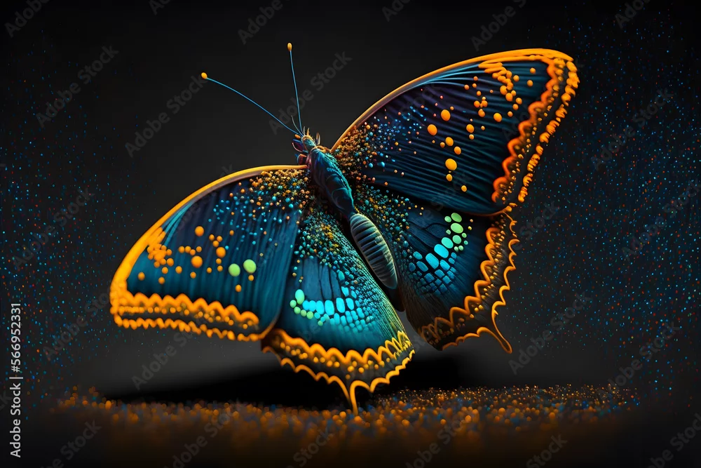 Fototapeta Magnifique papillon fluorescent aux couleurs turquoise et jaune orangée » IA générative