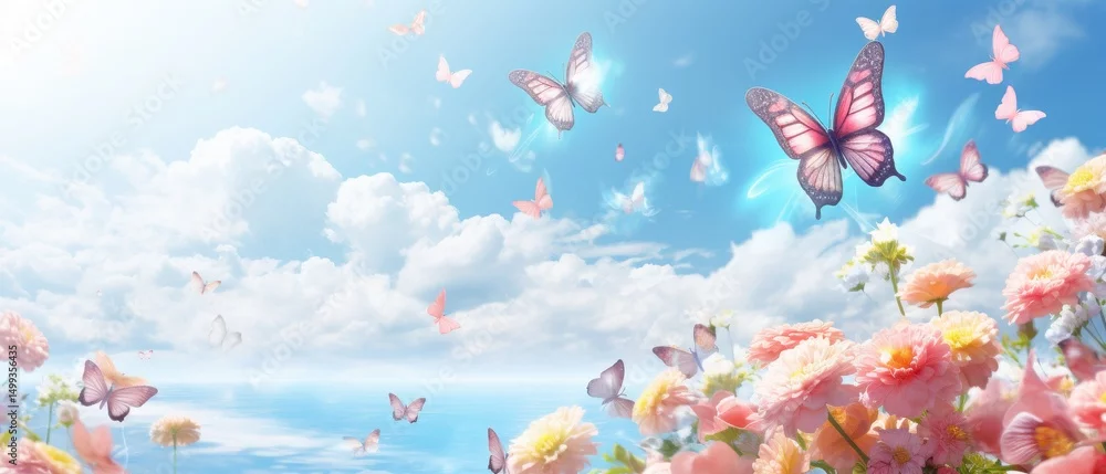 Fototapeta Motyle w locie nad kwiatami i chmurami