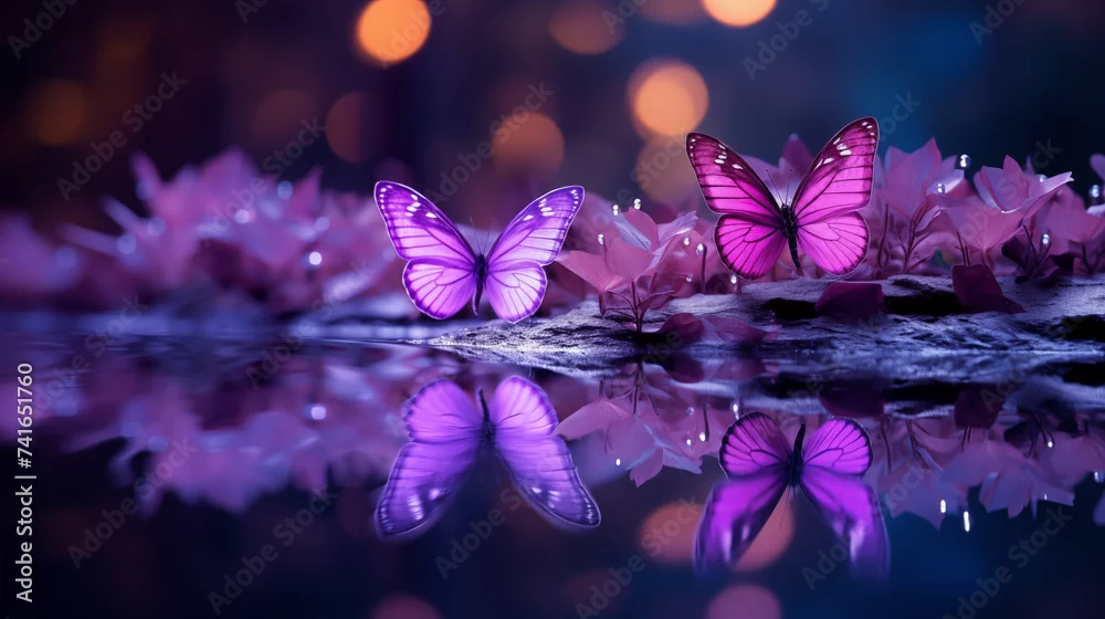 Fototapeta Papillons violets volant au dessus de l'eau. Lumière, reflet, couleurs. Ambiance magique, naturelle. Beauté et calme. Pour conception et création graphique