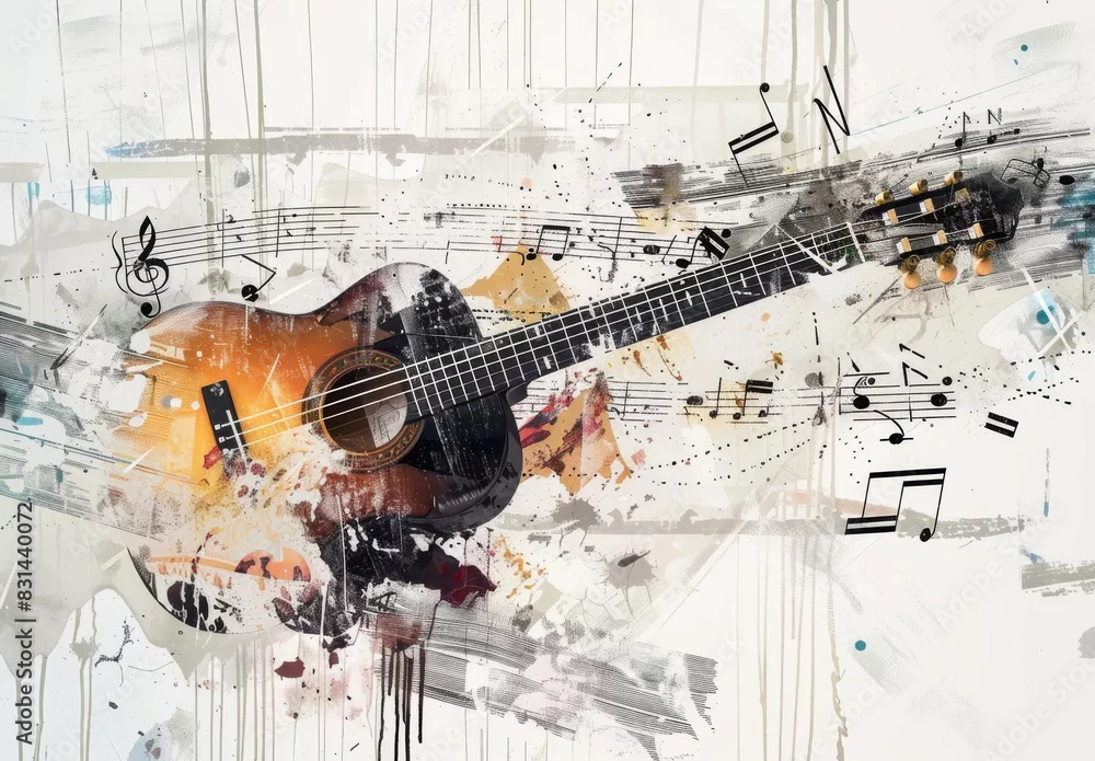 Modern art collage featuring a sketched acoustic guitar and music notes on a light background, symbolizing music, creativity, inspiration, and imagination. Perfect for greeting cards or magazine cover
