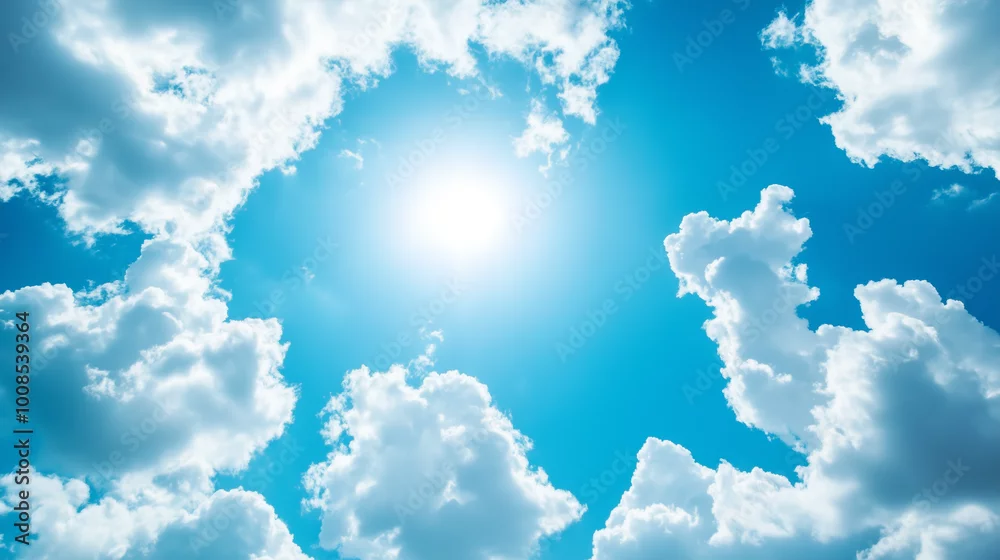 Fototapeta Bezchmurne niebo w odcieniach głębokiego błękitu jest ozdobione puchatymi, białymi chmurami, które delikatnie suną po horyzoncie.