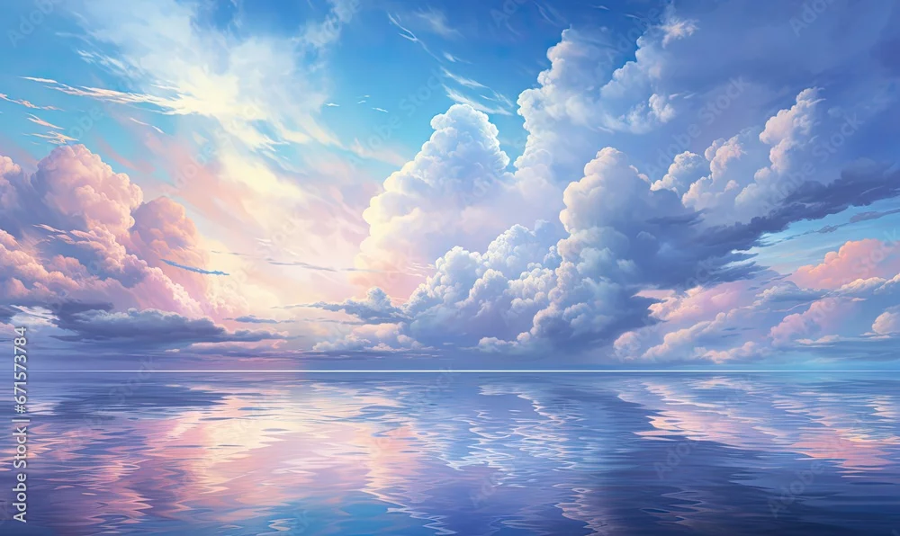 Fototapeta Kolorowe chmury w stylu anime. Kolorowy rysunek w pięknych pastelowych kolorach. Chmury odbijające się w oceanie.