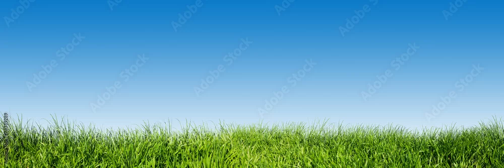 Fototapeta Zielona trawa na błękitne niebo jasne, motyw natury wiosna. Panorama - niebo - Picturewall.pl