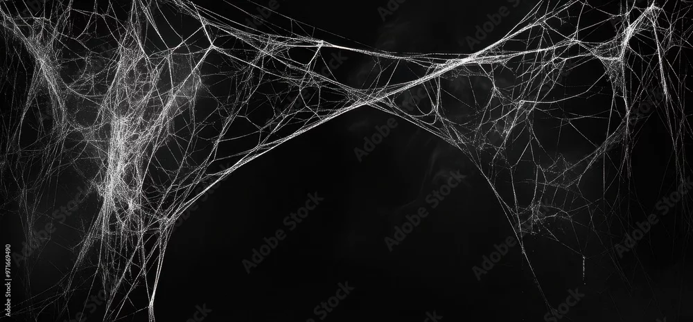 Fototapeta Black background with white spider webs, hanging from the left and right sides of the screen The webs are thin and long Generative AI