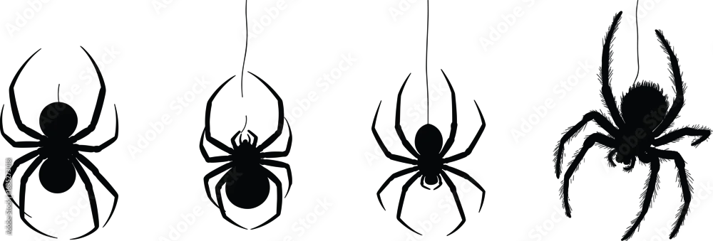 Set of hanging spider silhouettes in different positions, Halloween decoration, scary insect design, horror concept art, flat vector illustration