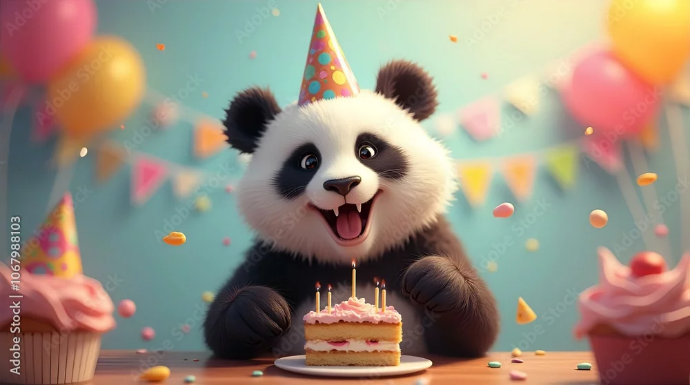 Fototapeta A charming, fluffy panda bear wearing a festive party hat sits at a table, beaming with happiness as it celebrates its birthday