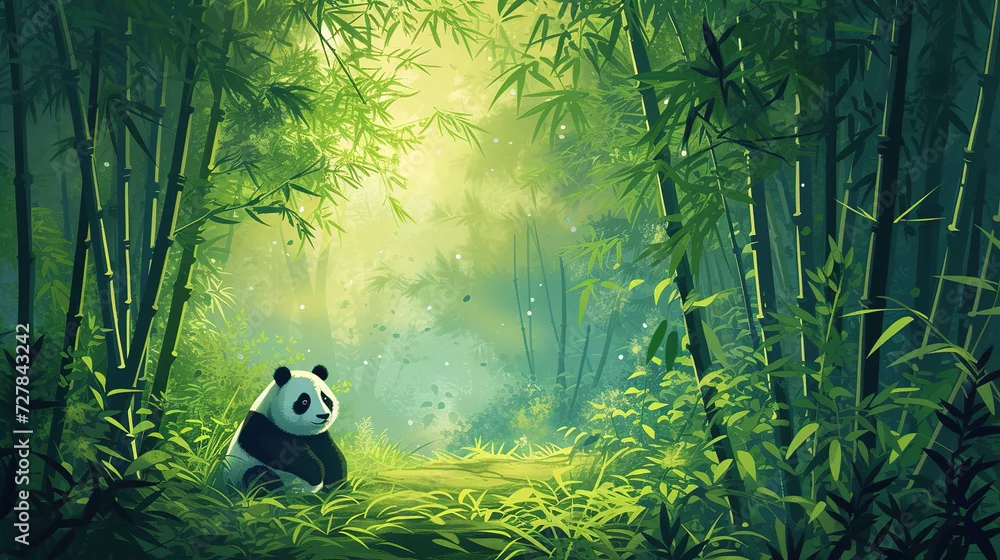 Fototapeta Beautiful scenic view of panda in the bamboo forest in landscape comic style.