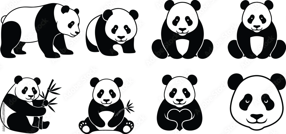Collection of cute panda bear vector illustrations in different poses. Set of eight black and white animal logos, icons, and mascot graphics