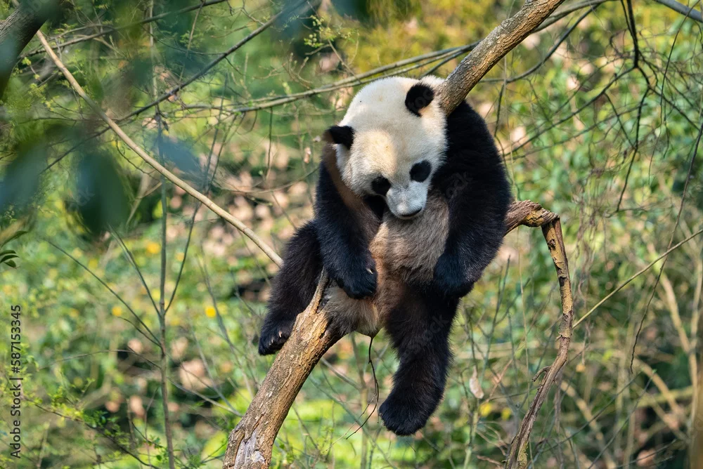 Fototapeta cute giant panda sleeping on a tree outdoor in the spring woods