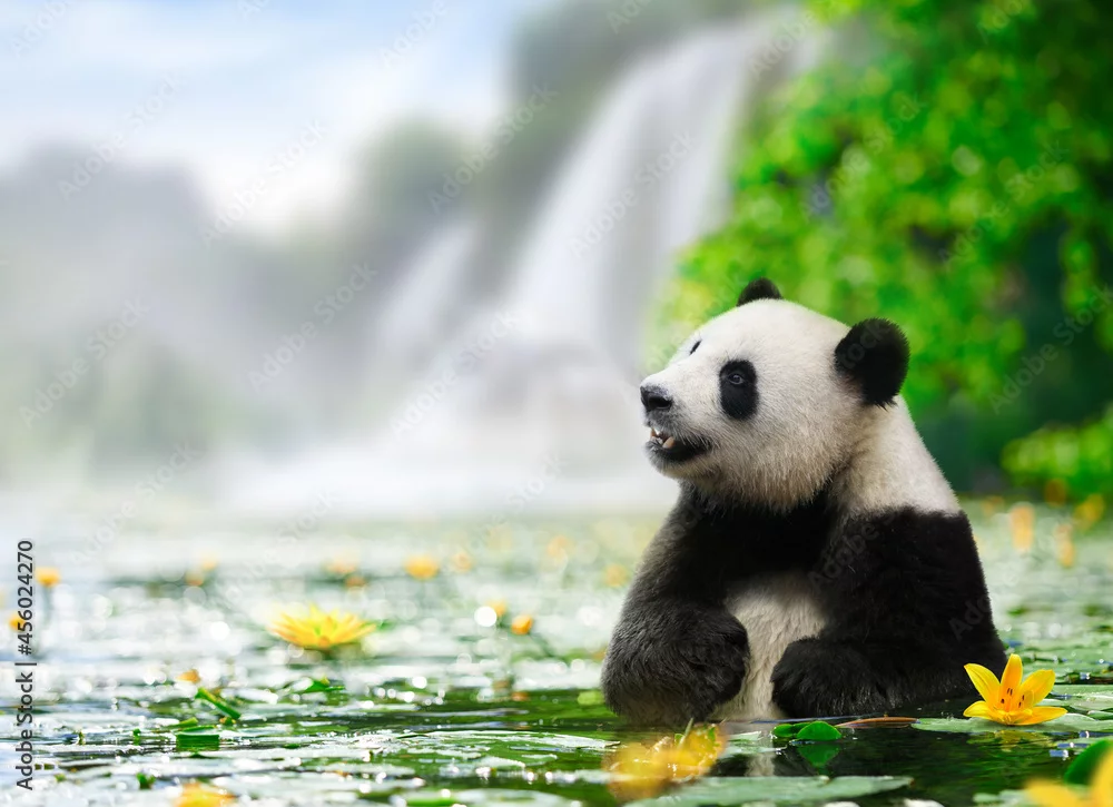 Fototapeta Panda enjoys bathing in a river with waterfall background