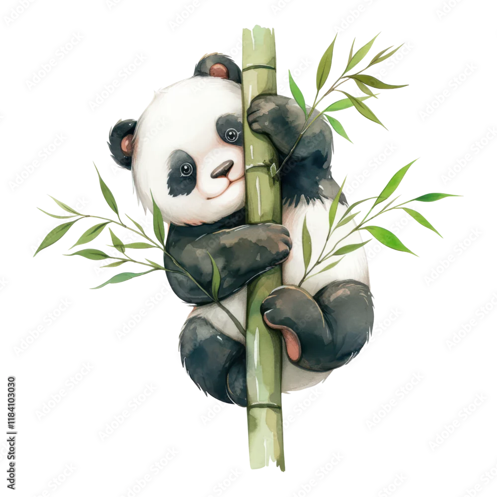 Fototapeta Playful panda climbing bamboo enchanted forest illustration vibrant whimsical scene - pandy - Picturewall.pl