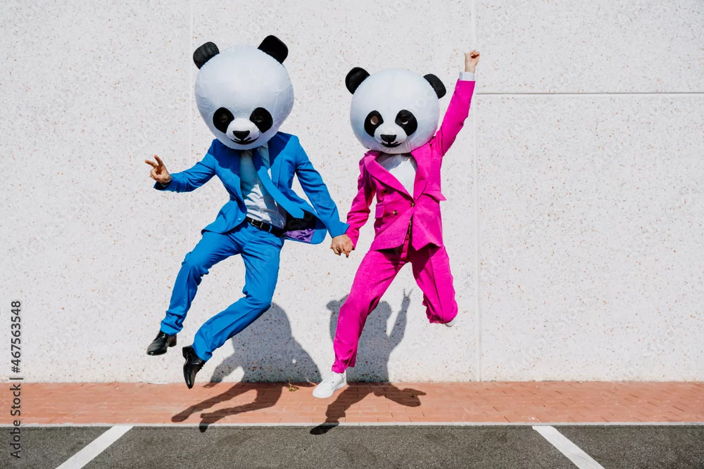 Fototapeta Storytelling image of a couple wearing giant panda head